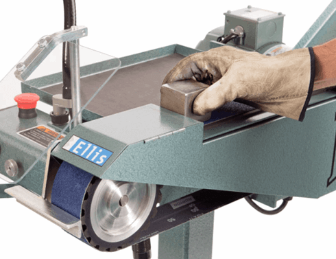 Equipped with both a contact wheel and a flat grinding surface, the Ellis 6000 Belt Grinder offers tremendous versatility. You can use this grinder on mild steel, tool steel, stainless steel, aluminum, brass, copper and hardened steel. Changing belts mid-job is quick and easy. A 50-grit belt is included with the grinder, and replacement belts are available in 36, 36, 50, 60, 80, 100, 120, 180 and 220 grit.) As with all grinders, gloves and eye protection are required to ensure the safety of the operator.