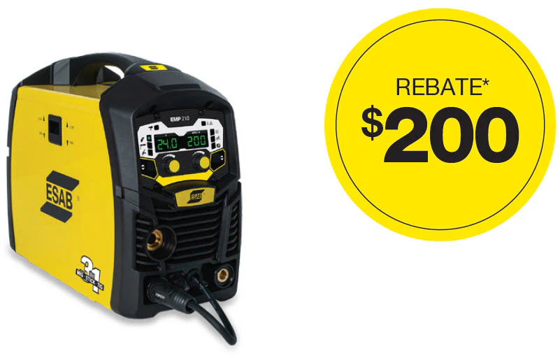 The ESAB® EMP 210 is a 200 amp portable multiprocess welding package that performs MIG, Stick and DC TIG welding.