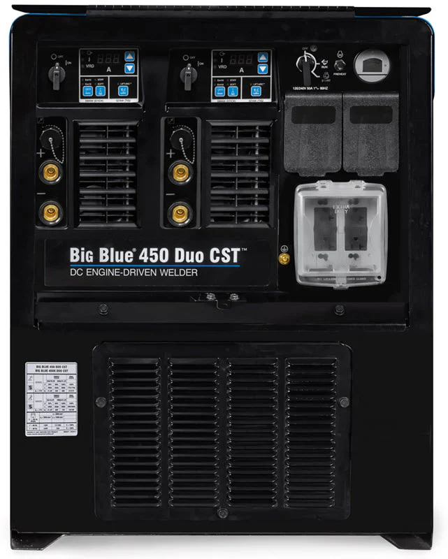 The Miller Big Blue® 450 Duo CST™ (Mitsubishi) combines the robust frame of a Miller diesel welder with the proven welding arc quality of twin CST 282 stick/TIG welders. The result is a rugged, compact, fuel-efficient diesel welder/generator that provides 2 superior arcs in one economical package. Each of the Duo CST’s independent arcs of up to 280 amps each is ideal for stick electrodes up to 3/16 inch diameter. Lift-Arc™ DC TIG is standard, for the welding of steel and stainless steel pipe and plate.