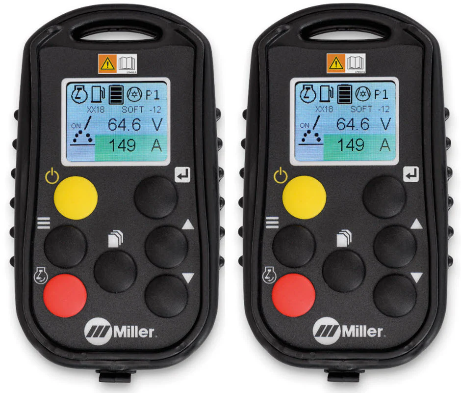 - Wireless Interface Controls – With wireless interface controls, you can change welding processes, adjust parameters, select and save preset programs, turn the machine on/off, get service reminders and more from wherever you are on the jobsite. Extend time between fill ups and maintenance intervals while eliminating the need to go back to your machine to make adjustments. Includes two handheld remote control units.View engine status, fuel level, and battery charge level of remote.