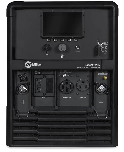 The Miller® Bobcat™ 265 engine driven welder is a 265 amp DC welder and 11,000 watt AC generator. Continuous 9,500 watts of auxiliary power are available at all times, even while operating at 100% welding output. Auxiliary power outlets include two 120 volt duplex w/GFCI, one 240 volt receptacle with circuit breaker, and one 120/240 volt receptacle with circuit breaker. Weighing in at just 385 pounds, the Bobcat 265 is 100 pounds lighter and 13% smaller than previous Miller Bobcat models. It is specifically designed to take up less room in your pick up truck or UTV. Miller’s exclusive AutoSet™ technology allows you to access pre-programmed welding parameters, based on metal thickness and welding process, for easy set up. You can also fine tune your output amperage and voltage manually, to suit your welding style.