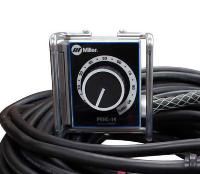Housed in a durable and light aluminum chassis case and a 125-foot (38 m) cord with plugs, the 195511 Miller Remote Hand Control is made to control your output power quickly and efficiently. The easy to use remote hand control is made for all solid-state power sources after serial number JK674521. The control knob allows for complete current or voltage control from 0 -100% and brings 120 volts of GFCI power to the work area in a single cord. The 14 pin connector fits the standard Miller 14 pin connector receptacles to allow for quick access and control of your welding generators. The control chassis includes a 120 V 20 A AC GFCI receptacle with Reset button as well for any additional equipment power.
