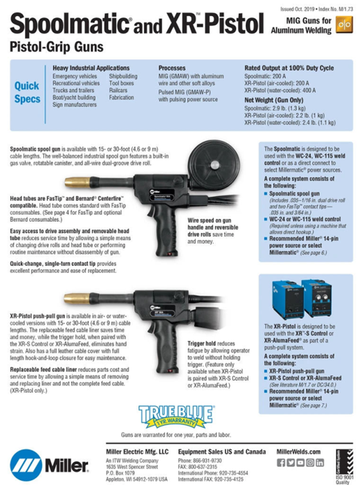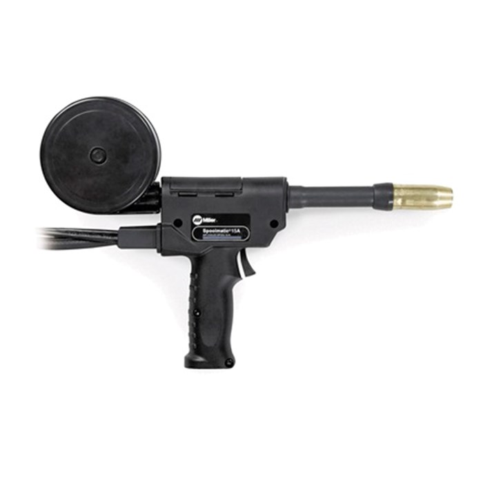 The Miller Spoolmate 200 is a light industrial spoolgun rated at 160 amps at 60% duty cycle. It’s ideal for welding with .023 to .035 wires. A 20′ direct-connect cable with heavy-duty strain relief is included for extended reach to your work. This cable connects this spoolgun to the Millermatic 212 Auto-Set, Millermatic 251 and Millermatic 252.